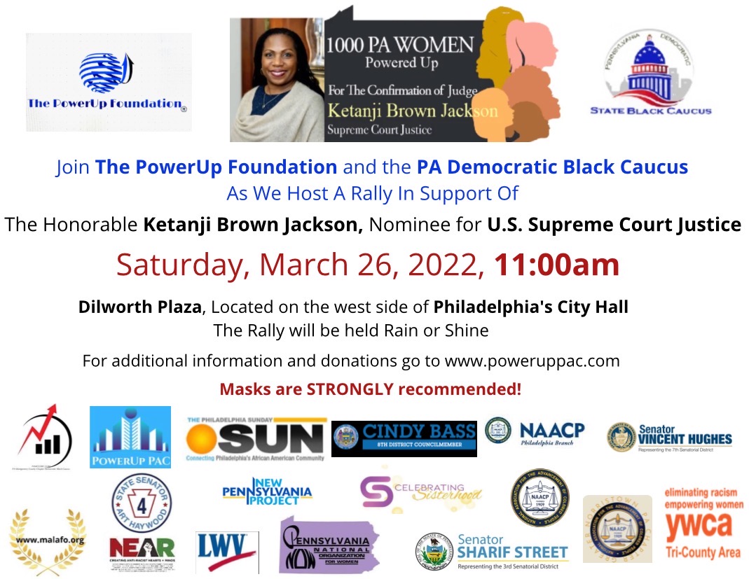The PowerUp Foundation, PA Democratic Black Caucus, WIN With Black Women, and a Coalition of other Women’s organizations, from across Pennsylvania, including Pennsylvania NOW have come together to host a rally to show support for the confirmation of U.S. Supreme Court nominee Judge Ketanji Brown Jackson. The theme for the event is KBJ—The Justice for…